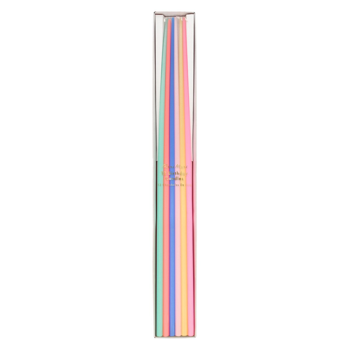 Ajoutez instantanément une touche de couleur et de fun à vos gâteaux de fête avec ces élégantes bougies fuselées. Leur grande hauteur crée un effet spectaculaire.
