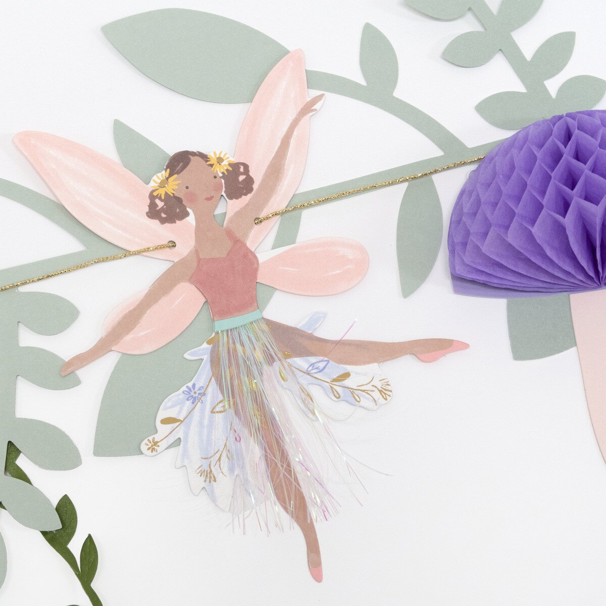 Cette magnifique guirlande apportera une touche encore plus magique à une fête thème fée ou princesse. Elle met en scène de jolies fées, des fleurs, des feuilles et des champignons, avec de superbes détails décoratifs pour un effet féerique garanti.