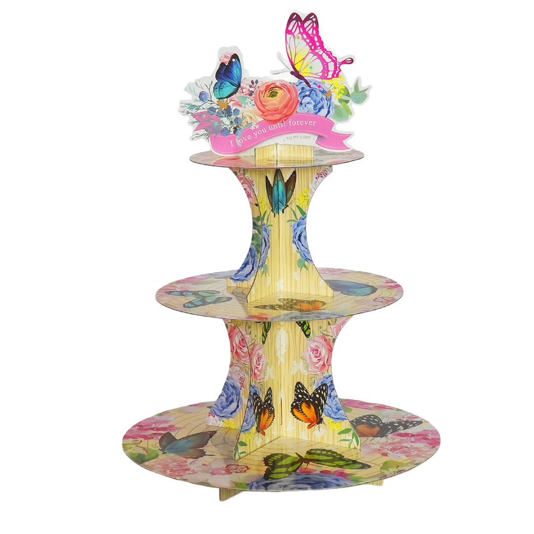 Apportez une touche élégante et féerique à votre table avec ce présentoir à cupcakes décoré de fleurs et papillons.