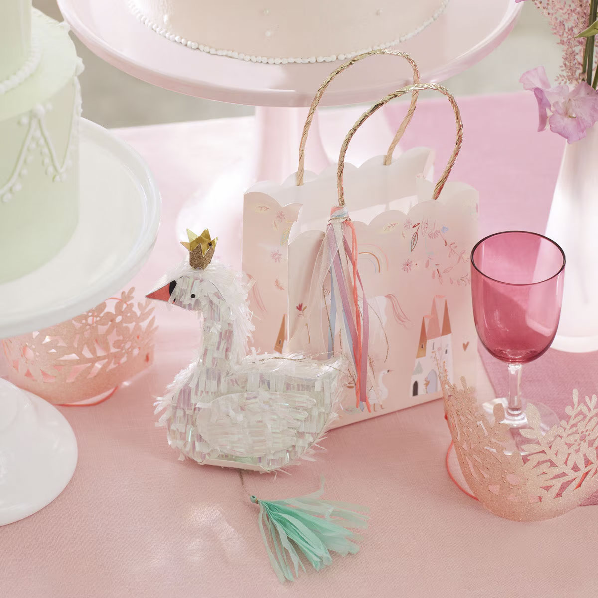 Les petites princesses et princes seront peut-être tristes que la fête se termine, mais ravis de repartir avec l’un de ces magnifiques sacs remplis de surprises ! Décorés de licornes, de châteaux et de cygnes, avec un joli pompon, un bord festonné et une anse dorée, ils apportent une touche finale magique à votre fête.